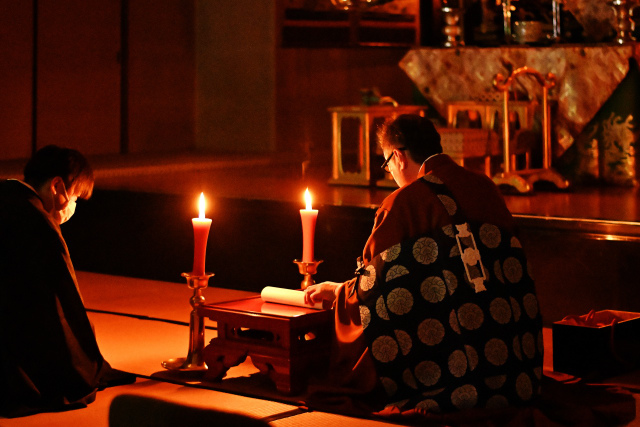 本堂内の電気がすべて消され、声明会の杉村住職により、ろうそくの明かりの下で厳かに御伝鈔が拝読され、滞りなく本日のお勤めを終えることができました。
