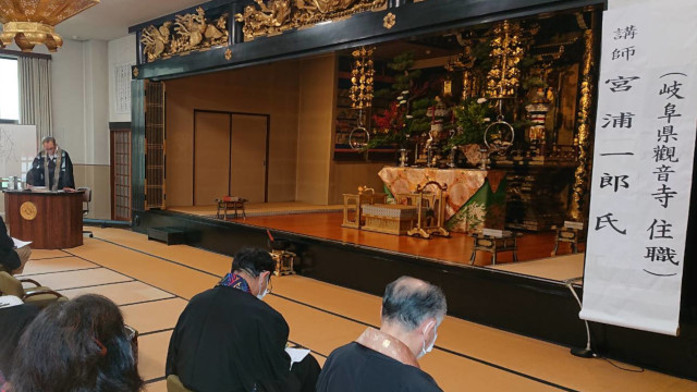教区内の仙台エリア・山形エリアからの、法中方による法要が勤まりました後、ご講師の宮浦一郎 (みやうら いちろう) 先生のご法話となりました。